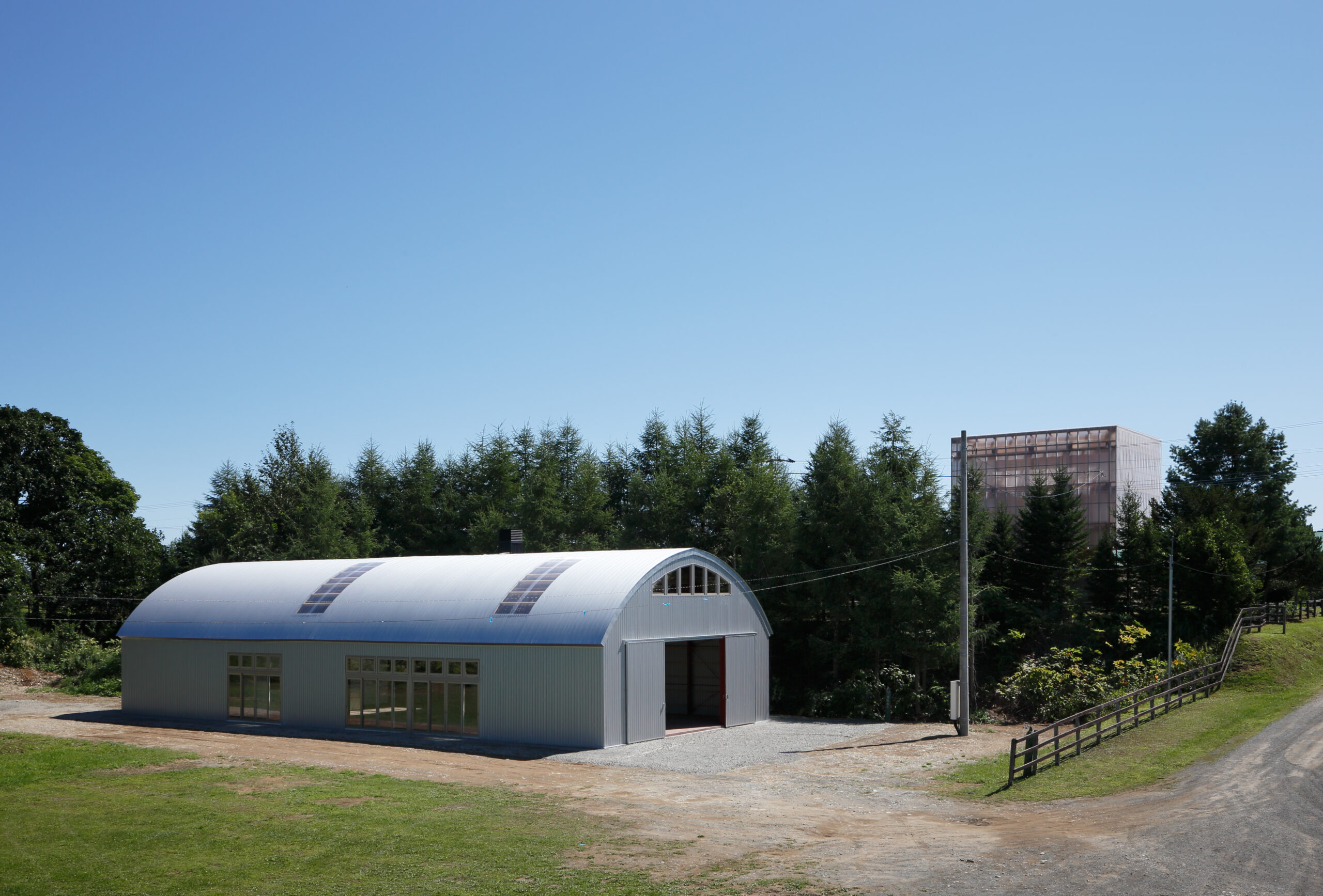 持続可能な住生活を実現するため、北海道大樹町に位置する寒冷地住宅実験施設内の計画である。実験施設の建物は、新築したものと、競走馬のためのファームとして使用していた建物を改装し使用しており、この計画では牧草保管用のD型倉庫をスタジオに改築した。