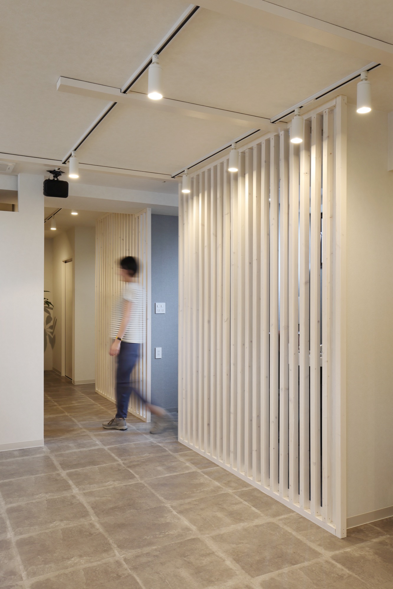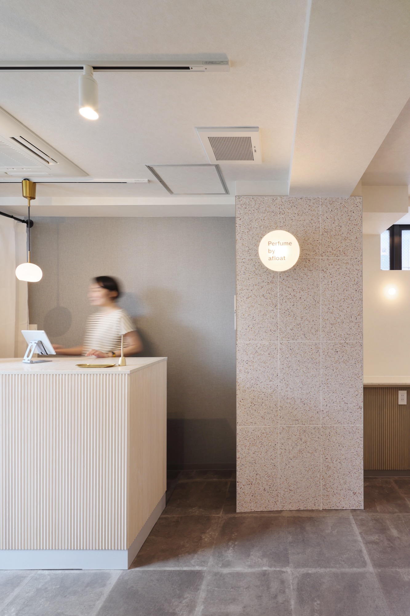 広く明るい開放的なメインスペースと対比的に、狭く落ち着いたシャンプーエリアはルーバーの壁でおだやかにつながるように心掛けた。木や石の本物の質感がお客様の目に近い部分に感じられるように、間仕切りやカウンターの素材として取り入れた。質感を大切にするサロンの想いが、その場所にいながら感じられることを目指している。