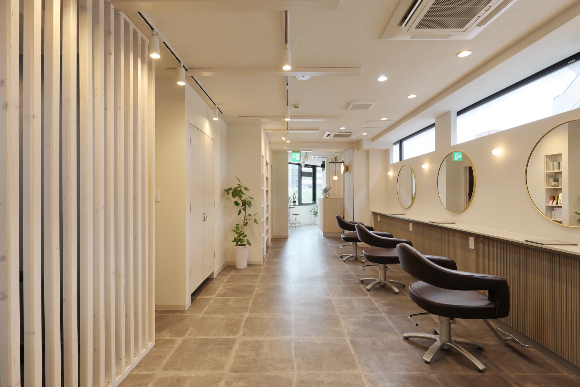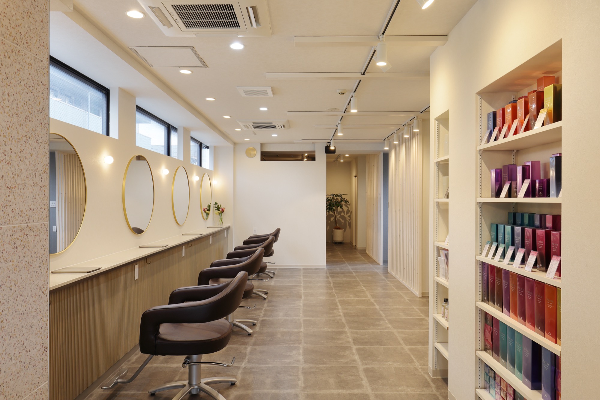 都内サロンから独立したオーナーの2店舗目となる美容室の内装計画。前にあった別の美容室を改修し、部分的に引き継ぎながら新店舗にふさわしい設えを整えた。